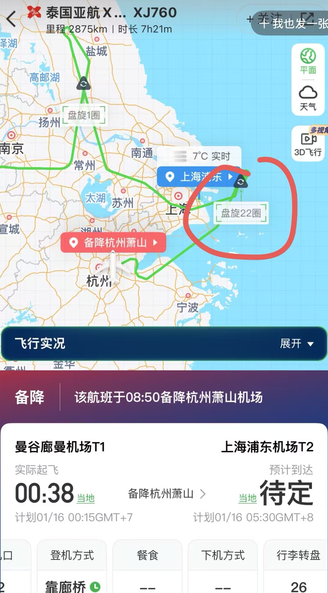 她原计划乘坐XJ760航班于当地时间0:15自曼谷起飞返回上海,却在抵达上海空域后因大雾无法降落,飞机持续盘旋长达数小时,绕飞达22圈。“所有人都盯着航迹图看,飞机一圈一圈地转,就是下不去。”安安表示,直到早上8:50,航班最终备降至杭州萧山机场。落地后,她又经历了数小时等待,“在机场椅子上睡睡醒醒”。